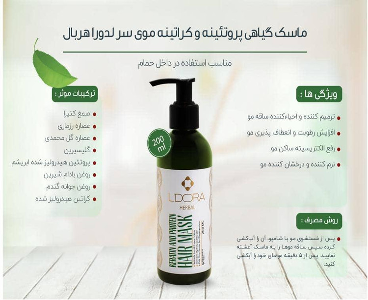 زیبایی و لطافت و درخشندگی رو به موهات هدیه کن ماسک مو کراتینه لدورا، در واقع یک ماسک مو داخل حمام گیاهی با قدرت و نرم کننده هست که به خاطر کراتینه و پروتئینه بودنش و با ویژگی های منحصر به فرد خودش از موهای شما مراقبت و به زیبایی آن ها کمک می کند. ویژگی ها ترمیم کننده و احیاء کننده ساقه مو حاوى بالاترین میزان مواد مغذی و پروتئینی نرم کننده و درخشان کننده مو افزایش رطوبت و انعطاف پذیری مو برگرفته از پروتئین های هیدرولیز شده ابریشم، کراتین و گندم رفع الکتریسیته ساکن مو مناسب استفاده در داخل حمام ثبت سایت botikdet. ir @ledora__beauty9 @ledora__beauty9 @ledora__beauty9